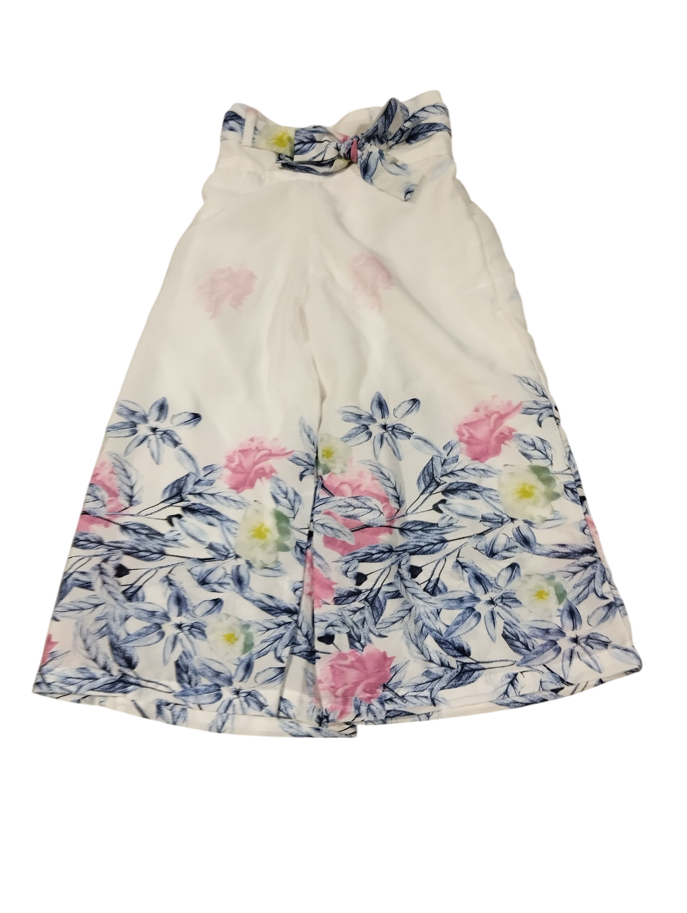 Color: White base with matching floral print concentrated around the lower part of the pants.