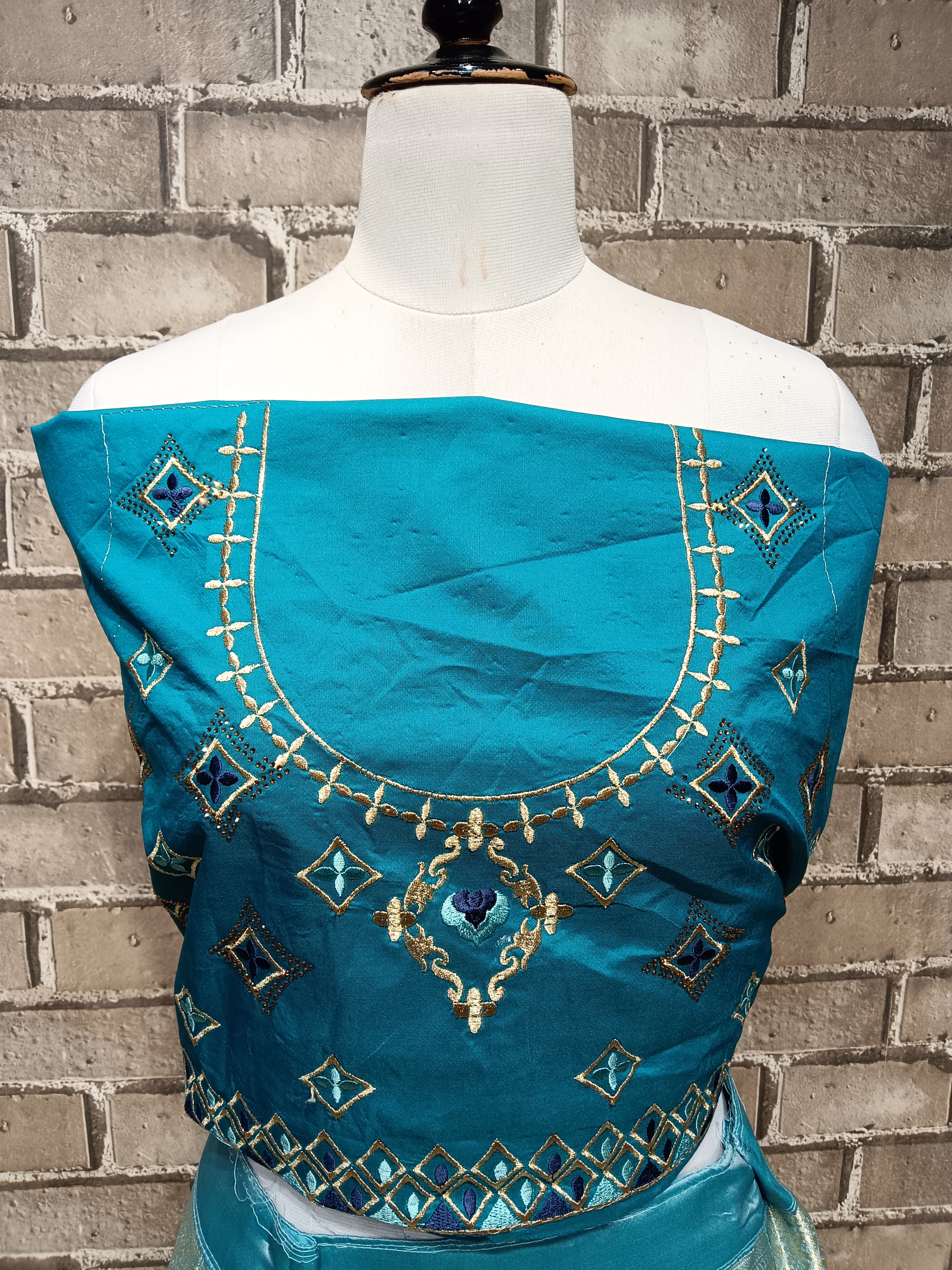 Choli (Blouse): Aqua Blue Banarasi Silk with zari motifs and embroidery